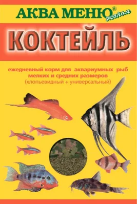 “Коктейль” — ежедневный корм для аквариумных рыб мелких и средних размеров (2-10 см): живородящих, цихлид, харациновых, лабиринтовых, карповых, различных сомов и др. “Коктейль” состоит из двух пакетов: 1) хлопьевидный корм — для рыб верхних и средних слоев аквариума и 2) универсальный корм для активно плавающих и донных рыб.