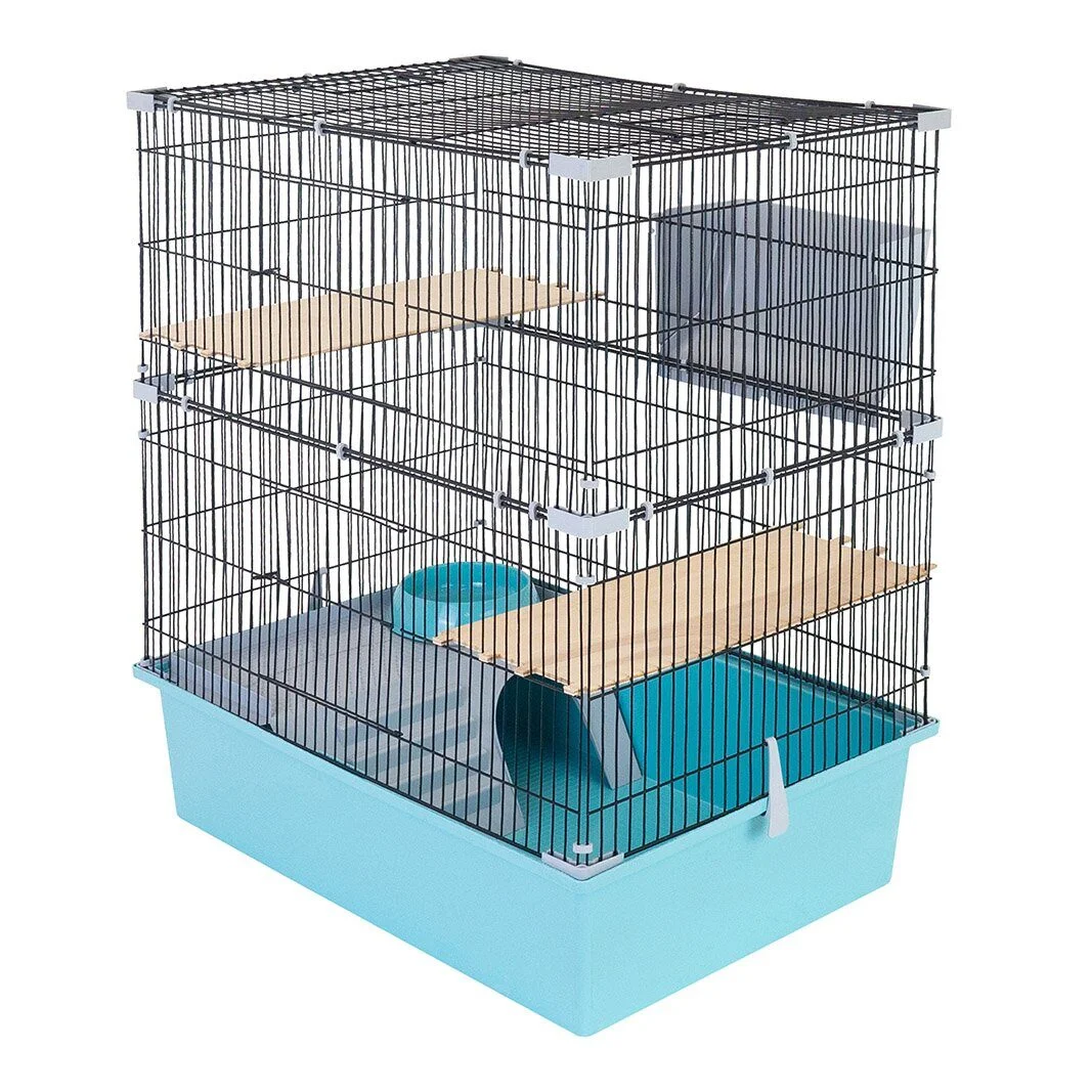Клетка для шиншилл металлическая на пластиковом поддоне. Разборная конструкция: 8 стенок и крыша. Дверца в передней (длинной) стенке. Дверцы в боковых (коротких) стенках. В комплекте пластмассовый сенник, этаж-домик, миска и 2 деревянные полочки. Расстояние между прутьями - 13,5 мм. Габаритные размеры клетки с поддоном: длина - 58см, ширина - 40см, высота - 65,5см. Высота поддона - 14 см. Цвет поддона - бирюзовый. Цвет прутьев - чёрный. Поставляется в разборном виде (компактная упаковка) в индивидуальной коробке.