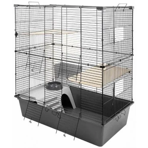 В комплекте пластиковый этаж с углублением под миску + 2 деревянные полочки, пластмассовый сенник (крепится снаружи на прутья).