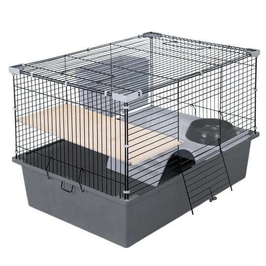 Клетка для грызунов металлическая на пластиковом поддоне. Разборная конструкция - 4 стенки и крыша. Дверца находится в передней стенке. В комплект входит пластмассовый сенник (крепится снаружи на прутья), так же 1 деревянная полочка, пластиковый этаж и миска. Расстояние между прутьями - 13 мм. Высота поддона - 15см. Цвет прутьев - черный. Цвет поддона - серый. Поставляется в сложенном виде (компактная упаковка).