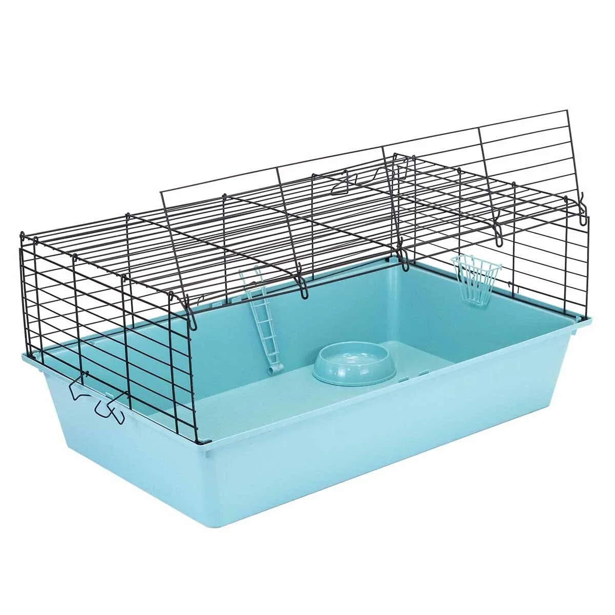 Клетка для кроликов металлическая на пластиковом поддоне. Разборная конструкция - 4 стенки и крыша. Передняя стенка является дверцей. Поставляется в сложенном виде (компактная упаковка). В комплекте: Кормушка для сена ЕВРО пластик 9,5х7,5х5см - 1 шт., Кормушка под морковку ЕВРО пластик - 1 шт., Миска ZERO пластиковая 200 мл - 1шт. Высота поддона 15 см. Размер клетки в собранном виде 78*48хh34см. Цвет поддона - бирюзовый. Цвет прутьев - черный.