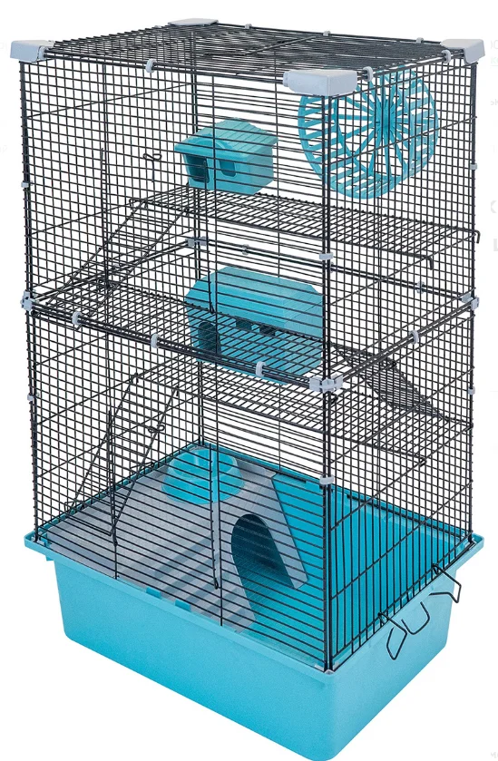 В комплекте: 1 пластиковый этаж, 3 металлических этажа с лестницей, 2 домика, колесо - 140мм, миска D100 - 70мл.