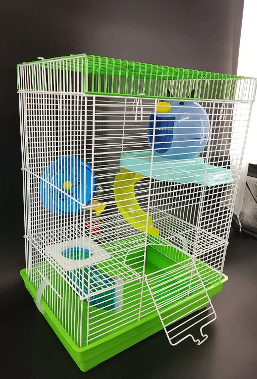 Клетка оснащена выдвижным люком сверху и откидной дверцей спереди, что позволяет легко обеспечивать доступ к Вашим любимцам и упрощает процесс их содержания. Для удобства перемещения она снабжена ручкой, благодаря которой Вы сможете без усилий переносить её из одного места в другое, а компактные размеры делают её идеальной для небольших пространств. В комплекте уже есть набор аксессуаров, чтобы Ваше животное чувствовало себя комфортно и было занято в течение дня: домик, где можно отдохнуть; две разные горки для перемещения между этажами; колесо для бега; поилка и кормушка, чтобы восстановить силы.