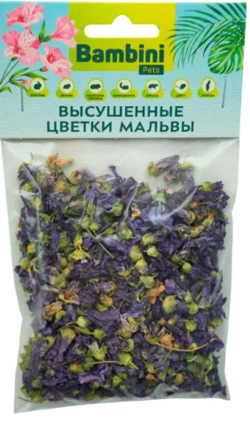 Высушенные цветки мальвы для маленьких питомцев, таких как кролик, крыса, морская свинка, шиншилла, дегу, хомячок и даже попугай! Это не только любимое, но и полезное лакомство грызунов, кроликов и птиц. Мальва богата витаминами, макроэлементами и антиоксидантами. Способствует улучшению пищеварения и поддержанию иммунитета . Bambini Pets делаем жизнь малышей лучше и радостнее!