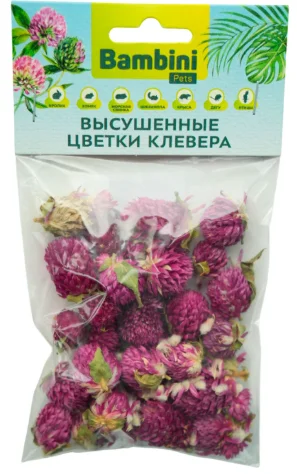 Высушенные цветки клевера для маленьких питомцев, таких как кролик, крыса, морская свинка, шиншилла, дегу, хомячок и даже попугай! Это не только любимое, но и полезное лакомство грызунов, кроликов и птиц… Клевер богат витаминами, макроэлементами и антиоксидантами. Обладает противогрибковыми, противомикробными и противовоспалительными свойствам. Bambini Pets делаем жизнь малышей лучше и радостнее!