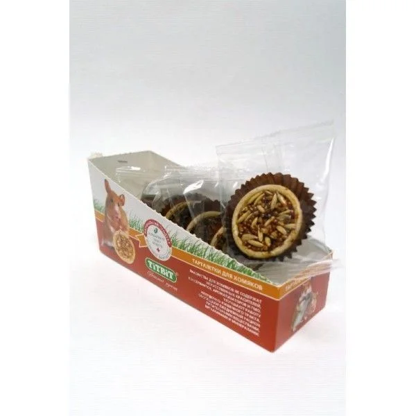 Тарталетки представляют собой корзиночки из хрустящего пресного теста с лакомой и полезной для грызунов начинкой. Обогащают ежедневный рацион витаминами, макро – и микроэлементами. Продукт не содержит искусственных красителей и ароматизаторов. Входящий в состав продукта кабачок легко усваивается организмом животного, содержит много полезных микроэлементов, оказывает положительное действие на нервную систему и регенерацию кожи. Фундук богат витамином Е и содержит фолиевую кислоту, необходимую для организма грызуна.