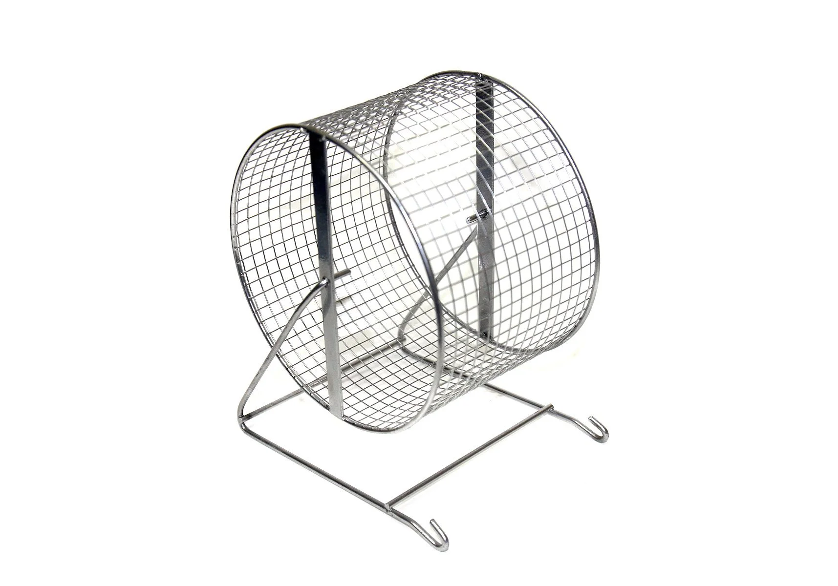 Представленное на картинке металлическое колесо с мелкой сеткой самое безопасное отличается от других тем, что его можно прикрепить к стене клетки или поставить на пол.