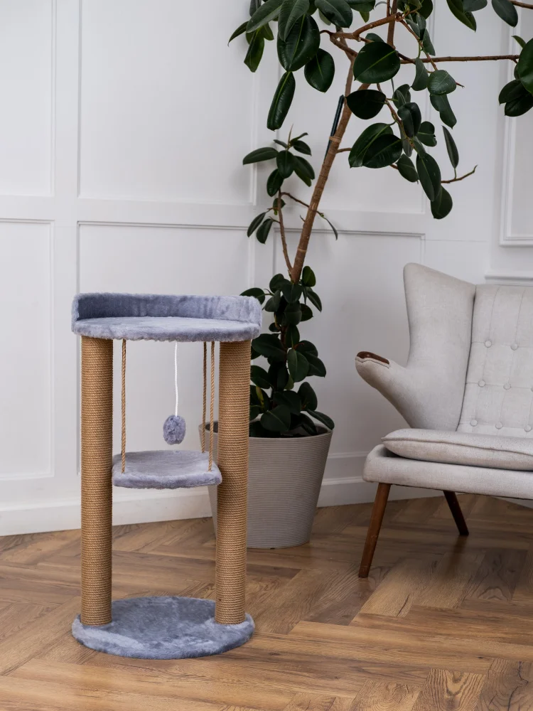 Джунгли - прочная и устойчивая когтеточка с большим круглым основанием диаметром 45 см, простая в уходе и сборке: все необходимые детали и инструкция входят в комплект. Утолщенные столбики диаметром 8,5 см имеют большую площадь для заточки когтей, а благодаря своей высоте - 75 см – позволяют питомцу вытянуться во весь рост. Просторная круглая верхняя полочка диаметром 45 см с игрушкой-помпоном вместит кота любого размера, а бортик поддержит его во время отдыха. И, конечно, особая любовь хвостиков – мягкий гамачок размером 25x40 см