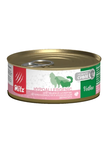 Корм консервированный Blitz Vetline Hypoallergenic полнорационный диетический для кошек при пищевой аллергии, непереносимости и атопическом дерматите.