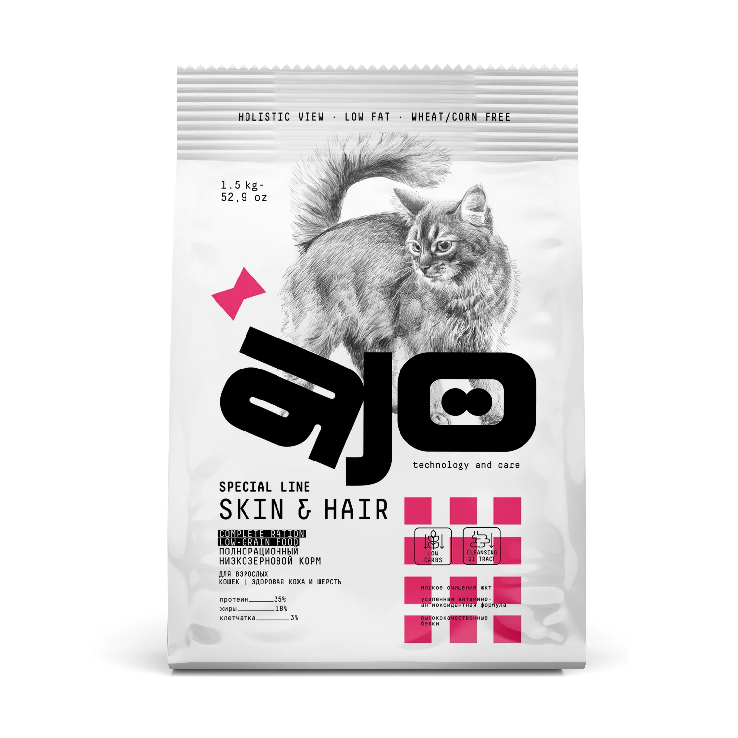 AJO Cat Skin & Hair Сухой полнорационный корм для кошек здоровая кожа и красивая шерсть AJO (Айо) - это идеальное решение для поддержания здоровой кожи и красивой шерсти вашего питомца. Этот корм супер-премиум качества, который имеет особый баланс аминокислот, витаминов и минералов, удовлетворяющий потребностям длинношерстных кошек, а также кошек