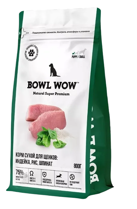 "BOWL WOW" С/К Д/ЩЕНКОВ МЕЛКИХ ПОРОД С ИНДЕЙКОЙ, РИСОМ И ШПИНАТОМ 800г 0026
