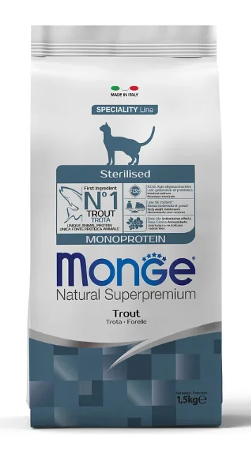 Monge (Монж) Cat Speciality Line Monoprotein сухой корм из форели для стерилизованных кошек и кастрированных котов.