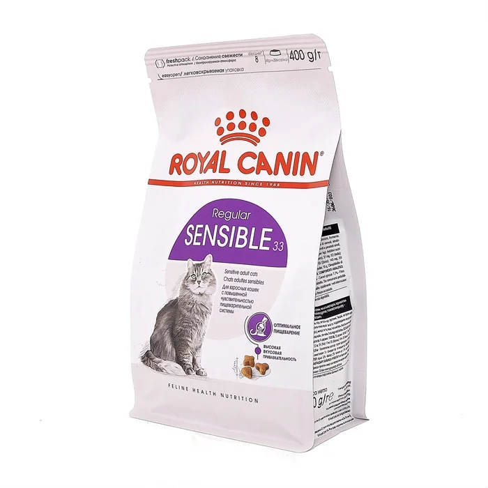 Royal Canin Sensible – корм для кошек старше 1 года, предрасположенных к пищевым расстройствам. Подобные проблемы могут возникать у домашних питомцев без видимых на то причин. Поэтому специалисты компании Royal Canin создали специальный сухой корм для кошек с чувствительным пищеварением. Данный продукт нельзя назвать заменителем лекарственных препаратов, но он способен смягчить проявление подобных расстройств.