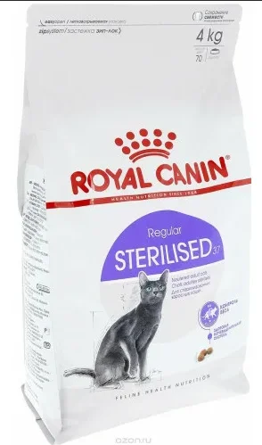 Сухой корм Royal Canin “Sterilised 37” - полнорационный сухой корм, который подходит стерилизованным кошкам в возрасте от 1 до 7 лет. Контроль потребления калорий. Корм Sterilised 37 ограничивает риск набора избыточной массы тела стерилизованной кошкой благодаря умеренному содержанию жиров (12%). L-карнитин способствует активной утилизации жиров. Поддержание мышечной массы кошки. Повышенное содержание (37%) белков высокой биологической ценности в корме способствует поддержанию мышечной массы и тонуса мышц стерилизованной кошки.