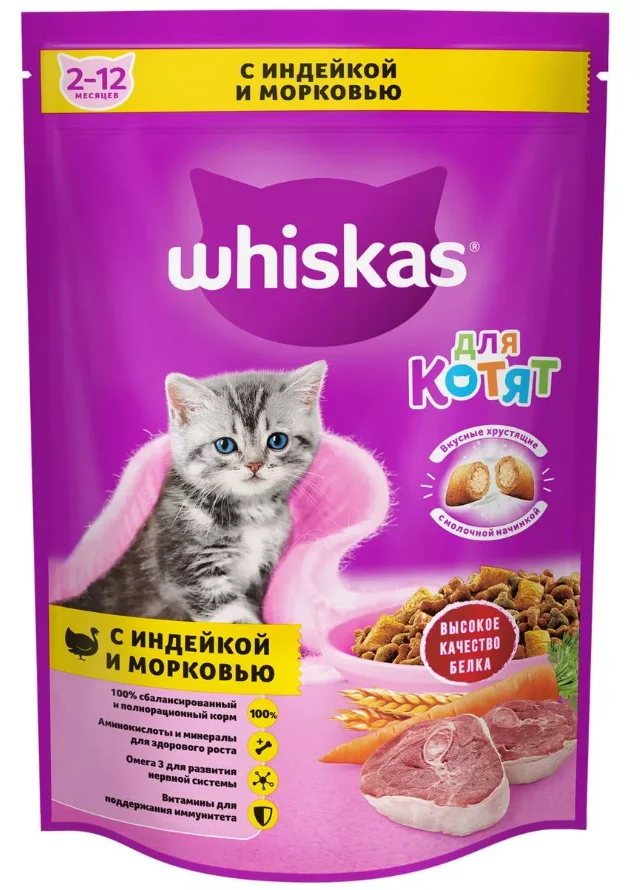 Это сбалансированный рацион для здоровой и счастливой жизни Вашего котенка. Хрустящие подушечки с молоком внутри обязательно придутся по вкусу Вашему любимимцу. Кроме того, Whiskas содержит все необходимое, чтобы еда Вашей кошки была не только вкусной, но и полезной. Whiskas это: Оптимальное сочетание питательных веществ и нутриентов для подержания обмена веществ Витамин Е и цинк для иммунитета Омега-6 и цинк для здоровья кожи и шерсти Баланс кальция и фосфора для здоровья костей Витамин А и таурин для хорошего зрения Высокоусваиваемые ингредиенты и клетчатка для пищеварения Сухая структура корма для удаления зубного налета