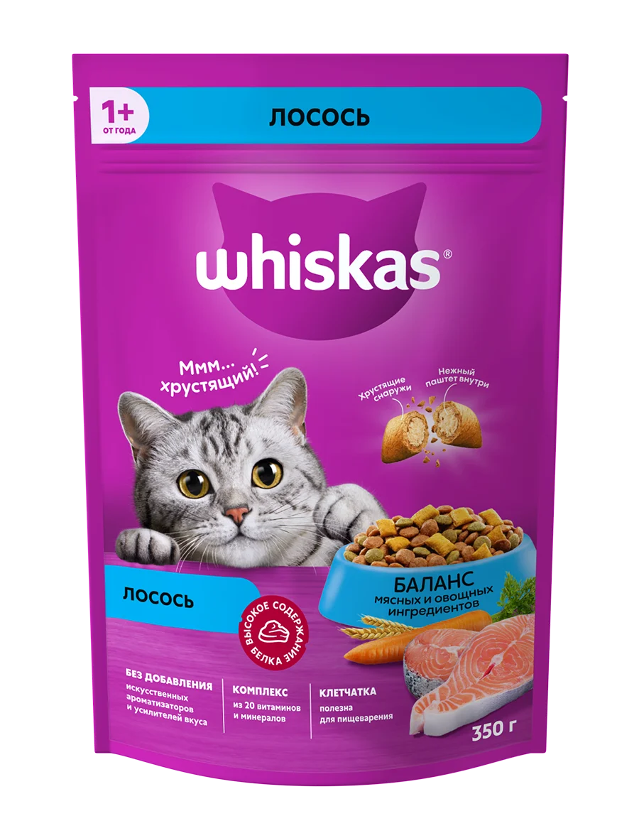 Это сбалансированный рацион для здоровой и счастливой жизни Вашей кошки. Хрустящие подушечки с нежным паштетом внутри обязательно придутся по вкусу Вашей любимице. Кроме того, Whiskas® содержит все необходимое, чтобы еда Вашей кошки была не только вкусной, но и полезной.