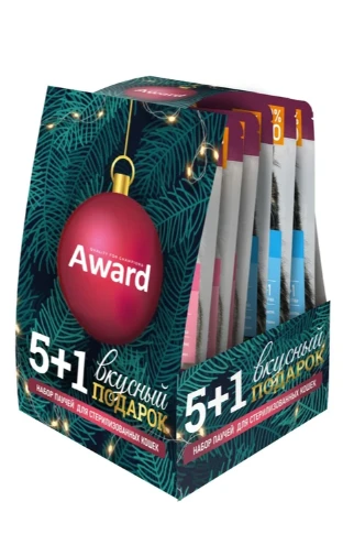 Рождественский набор пакетиков влажного корма для стерилизованных кошек бренда “Award” с выгодным предложением 5+1 призван скрасить праздничные дни и подарить замурчательное настроение.