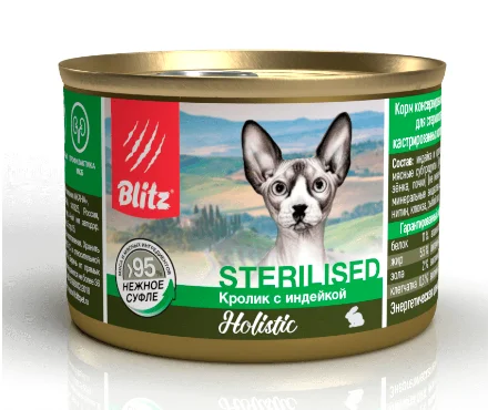 Состав: Индейка и кролик (не менее 48%), мясные субпродукты (не менее 48%) (лёгкое, печень, селезёнка, почки), витамины и минеральные вещества, DL-метионин, L-карнитин, клюква, рыбий жир. Богатый состав. Нежнейшая консистенция. Польза для здоровья. Как мы этого достигли? Выбрали в качестве мясной основы крольчатину и индейку (48%), дополнив её субпродуктами высокой пищевой категории (48%). Ввели в формулу специальные компоненты – помогающие сжигать жир и препятствующие образованию МКБ у животных. И наконец, приготовили консервы Blitz Holistic Sterilised Cat Rabbit & Turkey особым образом – получилось нежное суфле, которое ароматно пахнет и словно тает на язычке.