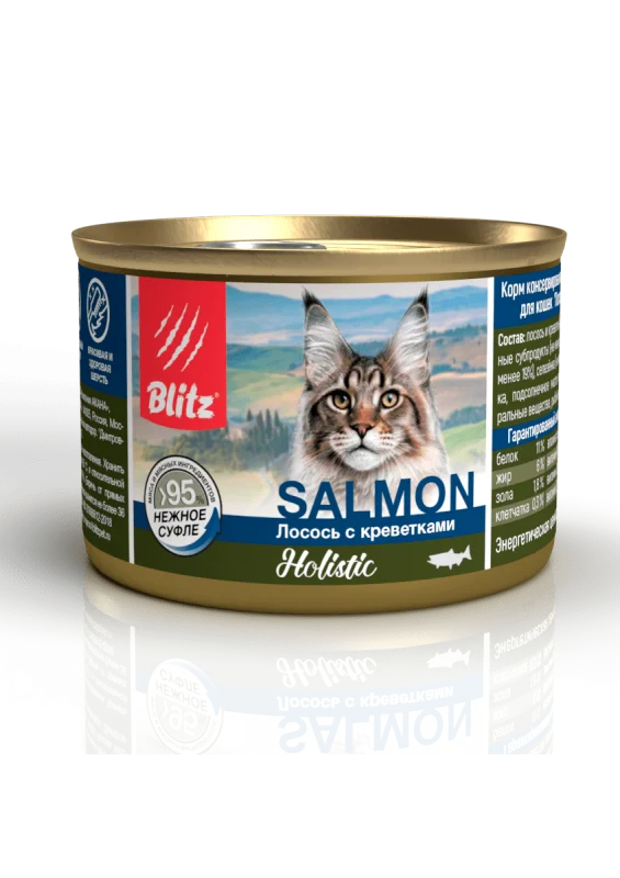 Нежное суфле линейки Blitz Holistic с натуральным лососем и мясом креветок – не просто сбалансированный полнорационный корм, а настоящий деликатес, и им можно кормить кошек на постоянной основе. Ваш любимец будет только благодарен! А его здоровье, настроение и внешний вид – скажут сами за себя. Консервы Blitz Holistic Salmon & Shrimps более чем на 95% состоят из животных ингредиентов, не содержат злаков и богаты всеми необходимыми аминокислотами, витаминами и минеральными веществами в легкоусвояемой форме.
