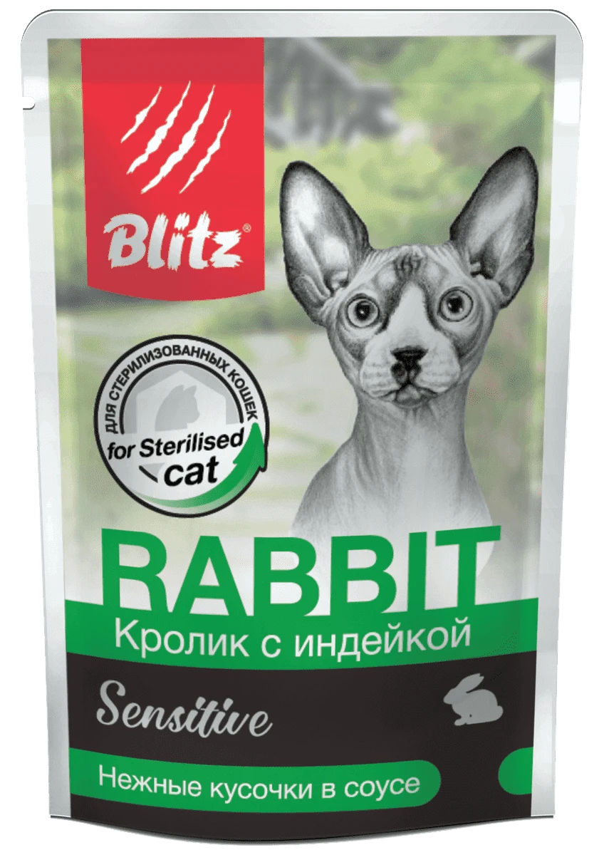 Особенностью состава влажного корма «Блиц» для стерилизованных кошек является сочетание двух диетических видов мяса — кролика и индейки, а также полезных потрошков (среди которых особо отметим печень и лёгкие — они придают корму привлекательный для кошек аромат и очень им нравятся). Кролик и индейка богаты животным белком, это маложирные виды мяса, при этом они богаты железом, медью, кобальтом, а также витаминами группы B.