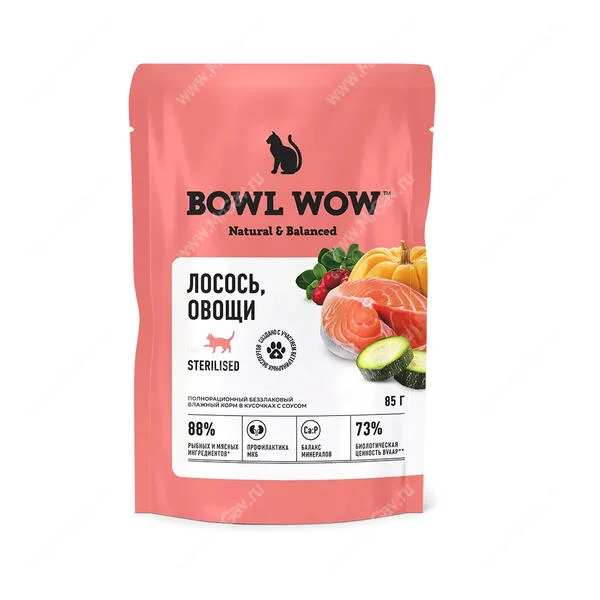"BOWL WOW" ПАУЧ Д/СТЕРИЛИЗОВАННЫХ КОШЕК (КУСОЧКИ В СОУСЕ С ЛОСОСЕМ И ОВОЩАМИ) 85г 2785