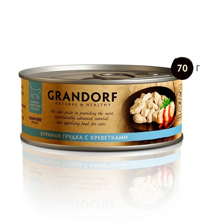 75 % мяса в составе (60 % куриная грудка, 15 % креветки).