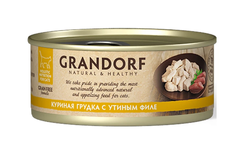 75 % мяса в составе (65 % куриная грудка, 10 % филе утки).