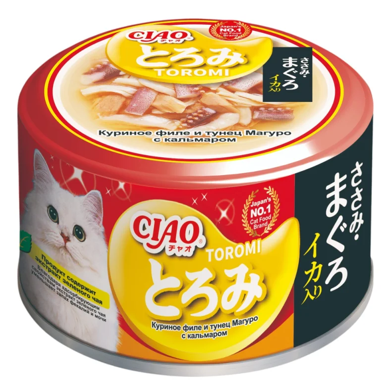 Суперпремиальный влажный корм для кошек Ciao Toromi (ЧАО ТОРОМИ) от японского производителя Inaba приготовлен на основе нежного куриного филе, кусочков глубоководного тунца с добавлением кальмара и насыщенного фирменного бульона. Корма и лакомства Inaba отличаются высоким качеством и неповторимым вкусом, ведь они изготавливаются на основе отборных традиционных японских ингредиентов! Во все продукты добавлен экстракт зеленого чая, который, благодаря содержанию катехина, обладает нейтрализующим действием на запах содержимого кишечника. Корм обогащён витамином Е - натуральным антиоксидантом, поддерживающим иммунную систему, не содержит искусственных добавок, красителей и консервантов.