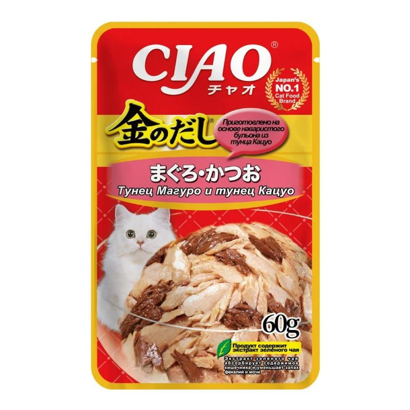 Суперпремиальный влажный корм для кошек CIAO Kinnodashi (ЧАО КИННОДАШИ) от японского производителя Inaba приготовлен на основе нежных кусочков двух разных видов мяса глубоководного тунца в аппетитном насыщенном бульоне золотистого цвета. Корма и лакомства Inaba отличаются высоким качеством и неповторимым вкусом, ведь они изготавливаются на основе отборных традиционных японских ингредиентов! Во все продукты добавлен экстракт зеленого чая, который, благодаря содержанию катехина, обладает нейтрализующим действием на запах содержимого кишечника. Корм обогащён витамином Е - натуральным антиоксидантом, поддерживающим иммунную систему, не содержит искусственных добавок, красителей и консервантов.