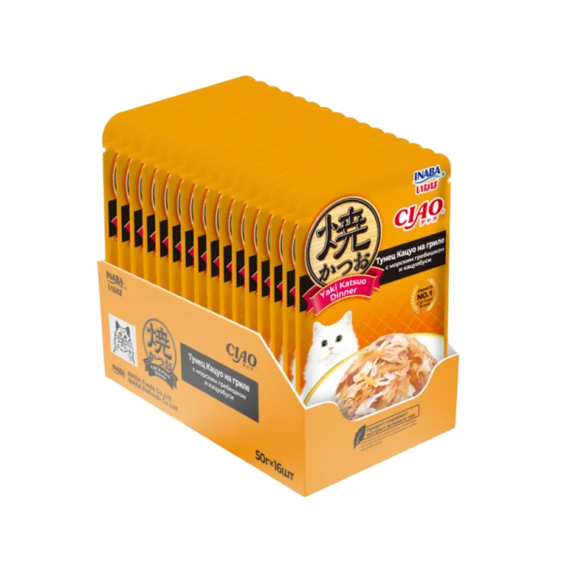 Суперпремиальный влажный корм для кошек CIAO Yaki Katsuo Dinner (ЧАО ЯКИ КАЦУО ДИННЕР) от японского производителя Inaba приготовлен на основе тунца Кацуо, приготовленного на гриле, с добавлением морского гребешка и кацуобуси. Аромат и вкус данного корма не оставит равнодушной ни одну кошку. Корма и лакомства Inaba отличаются высоким качеством и неповторимым вкусом, ведь они изготавливаются на основе отборных традиционных японских ингредиентов! Во все продукты добавлен экстракт зеленого чая, который, благодаря содержанию катехина, обладает нейтрализующим действием на запах содержимого кишечника. Корм обогащён витамином Е - натуральным антиоксидантом, поддерживающим иммунную систему, не содержит искусственных добавок, красителей и консервантов.