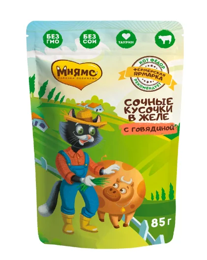 Влажный корм “Фермерская ярмарка” линии Кот Федор - это сбалансированный рацион, который обязательно понравится вашей кошке. Насыщенный вкус говядины в каждом кусочке порадует как активного исследователя, так и домоседа, и позволит почувствовать себя настоящим фермерским жителем. -Без ГМО -Без сои -Без консервантов -Без ароматизаторов -Без усилителей вкуса -Без искусственнх красителей Корма и лакомства от “Мнямс” - для всех, кто умеет любить.