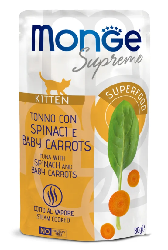 Влажный корм Monge Supreme kitten для котят из тунца со шпинатом и мини-моркови, консервы 80 г