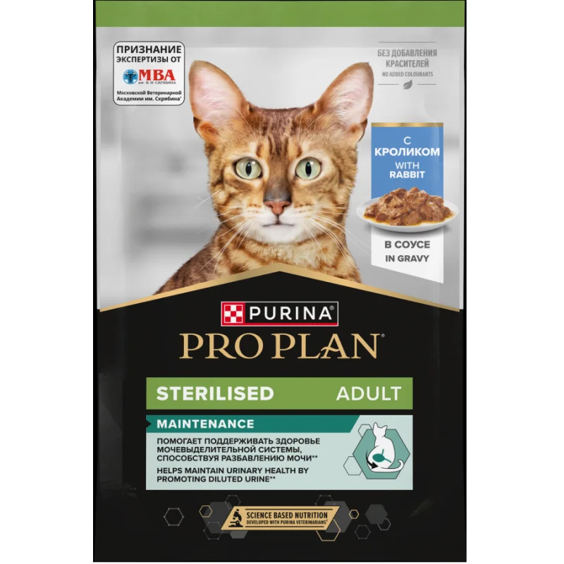 Команда квалифицированных ветеринарных специалистов разработала влажный корм для стерилизованных кошек PRO PLAN Sterilised MAINTENANCE с кроликом. Этот полнорационный корм для кошек разработан с учетом их потребностей в высококачественном белке, а также витаминах и минералах, необходимых для нормального функционирования организма.