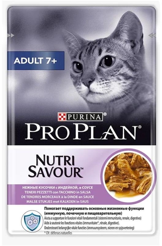 Влажный корм для кошек старше 7 лет Adult 7+ Содержит LONGEVIS®, уникальное сочетание питательных веществ, в том числе антиоксидантов, жирных кислот омега-2 и омега-6 и пребиотика, который способствует увеличению продолжительности жизни кошек старше 7 лет и улучшает ее качество, имеет научное обоснование. Исследование проводилось на примере 90 кошек в возрасте от 7 до 17 лет. Представленные данные были получены путем сравнения данных по группе кошек, чей корм был обогащен LONGEVIS®, и контрольной группе кошек, получавших обычный сбалансированный рацион. Европейский патент EP1637041B1. Помогает поддерживать основные жизненные функции (иммунную, почечную, пищеварительную) благодаря высокому содержанию витаминов и дополнительного бета-каротина, прекрасно усваивается.