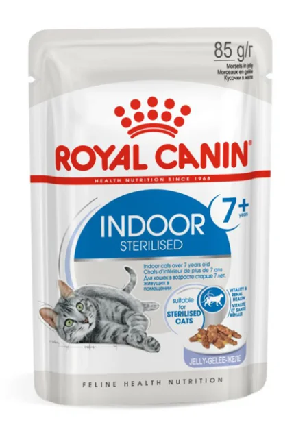 Корм консервированный полнорационный для взрослых кошек (в возрасте от 7 до 12 лет) INDOOR STERILISED 7+, мелкие кусочки в желе - влажный корм, подходящий для взрослых кастрированных и стерилизованных кошек, живущих в помещении, специально разработан с учетом потребностей вашей кошки в питательных веществах.