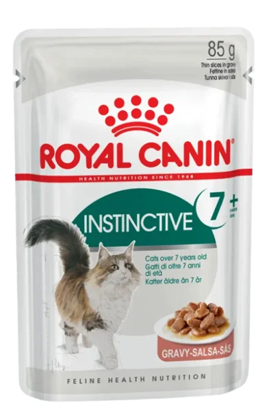 Корм консервированный полнорационный для кошек INSTINCTIVE 7+, мелкие кусочки в cоусе – влажный корм для кошек в возрасте старше 7 лет, специально разработан с учетом потребностей вашей кошки в питательных веществах.