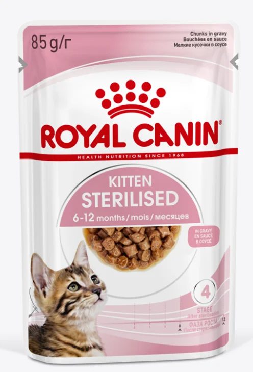Корм консервированный полнорационный для кастрированных и стерилизованных котят KITTEN STERILISED, мелкие кусочки в соусе - влажный корм для стерилизованных котят в возрасте от 6 до 12 месяцев.