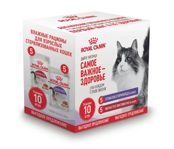 Промо-набор! ROYAL CANIN STERILISED для взрослых кастрированных котов и стерилизованных кошек кусочки в соусе и ROYAL CANIN INSTINCTIVE для взрослых кошек кусочки в соусе.