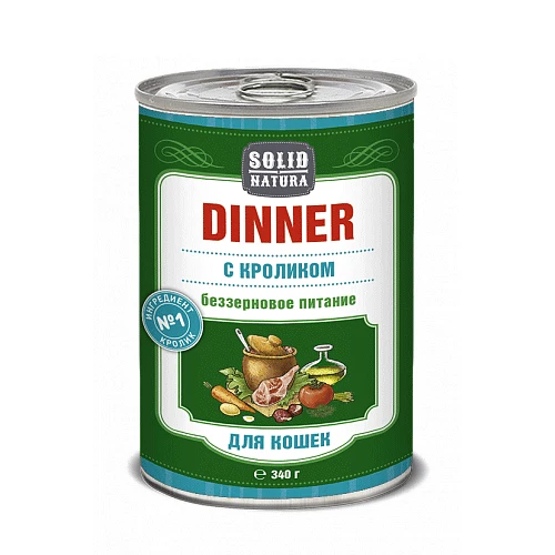 Влажный корм для кошек “Solid Natura Dinner” с кроликом - консервированное питание класса премиум. Нежная консистенция в виде фарша, отличная поедаемость, в составе отсутствуют зерновые культуры. Изготовлено из натурального мясного сырья, не содержит сою, ароматизаторы и ГМО.