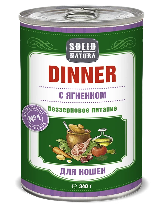 Влажный корм для кошек “Solid Natura Dinner” с ягненком - консервированное питание класса премиум. Нежная консистенция в виде фарша, отличная поедаемость, в составе отсутствуют зерновые культуры. Изготовлено из натурального мясного сырья, не содержит сою, ароматизаторы и ГМО.