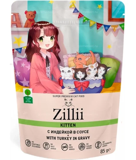 Растущий котенок требует особого внимания к питанию, как гарантии получения всех необходимых питательных веществ для роста и развития. Полнорационный влажный корм ZILLII KITTEN with Turkey in gravy разработан с учетом всех потребностей и особенностей организма котенка. Повышенное содержание питательных веществ, необходимых витаминов и важных минералов поддерживают в норме работу всего организма в период активного роста котенка. В составе рецептуры присутствует мясо индейки - наиболее диетическое и «нежное» мясо, обладающее прекрасной усвояемостью и содержанием питательных веществ. Содержащийся в индейке натрий помогает пополнить объемы плазмы в крови и обеспечить нормальные обменные процессы. Питание для котят ZILLII KITTEN with Turkey in gravy полностью способно удовлетворить все потребности растущего организма животного в питательных веществах, витаминах и минералах.