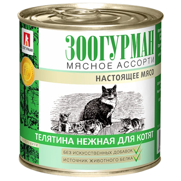 Состав: телятина, субпродукты говяжьи, натуральная желирующая добавка, вода, растительное масло.