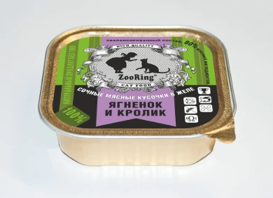 Мясо и субпродукты не менее - 80% (в том числе ягненок - минимум 5%, кролик - 10%), таурин, клетчатка, витамины (А - не менее 180 МЕ, Е - не менее 0,5 мг, Д3 - не менее 0,6 мкг), микроэлементы (цинк, йод, марганец), антиоксиданты.