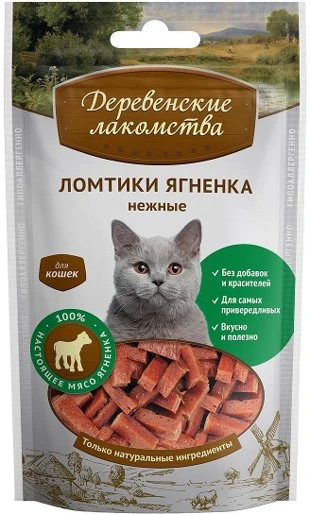 Побалуйте своего питомца вкусным и полезным лакомством от торговой маркиДеревенские лакомства. Кусочки нежнейшего мяса ягненка придутся по вкусу даже самым привередливым кошкам. Диетическое мясо является гипоаллергенным, легко усваивается, поэтому подходит даже котятам. Продукт изготавливается без добавления красителей, консервантов и специй. Содержит необходимые животному витамины, микроэлементы и минералы. Сочные ломтики ягненка отлично дополнят основной рацион вашего любимца.