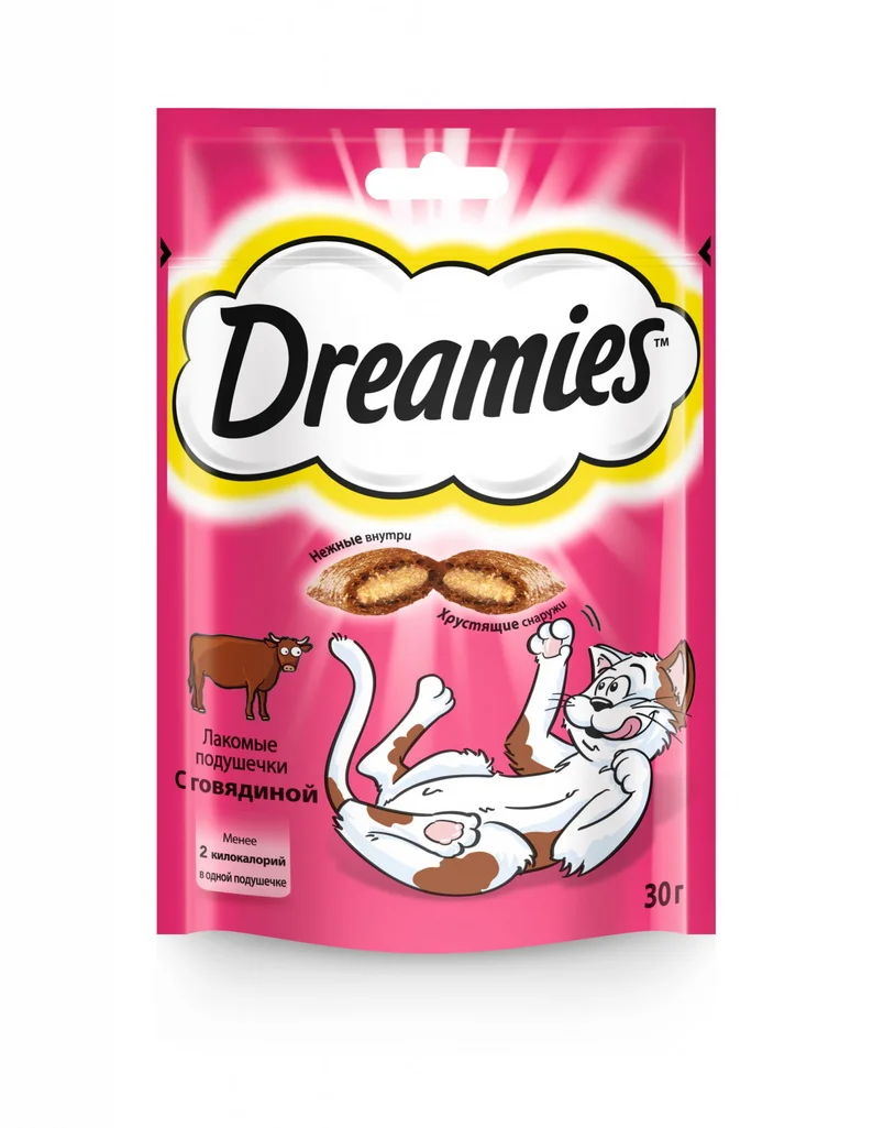 Dreamies™ с говядиной – настоящее мясное лакомство для вашего питомца! Покажите вашему коту эту упаковку нежных внутри и хрустящих снаружи подушечек, и он будет в восторге. Устройте ему настоящий праздник мяса! В состав Dreamies™ Лакомые Подушечки входят важные для кошки питательные вещества, витамины и минералы, а значит, такое угощение приносит не только радость, но и пользу. Кошкам нравится разнообразие в питании и сочетание текстур. Именно поэтому ассортимент вкусов, хрустящая текстура снаружи и нежный паштет внутри делают это лакомство необыкновенно вкусным. Вы можете давать лакомство Dreamies™ каждый раз, когда хотите побаловать любимца.