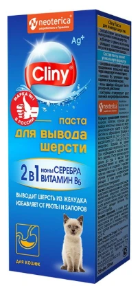 Паста для вывода шерсти “Cliny” c ионами серебра Ag+, обладает приятным для питомца вкусом и специфическим ароматом. Ее можно добавлять в еду или же скармливать с руки.