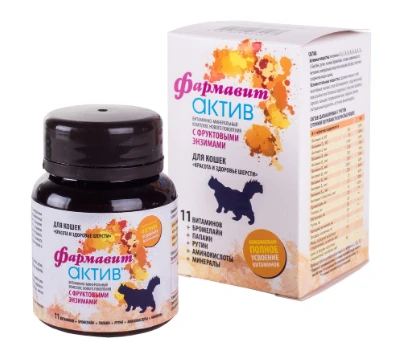 Фармавит Актив – витаминно-минеральный комплекс нового поколения с фруктовыми энзимами для кошек “Красота и здоровье шерсти”.