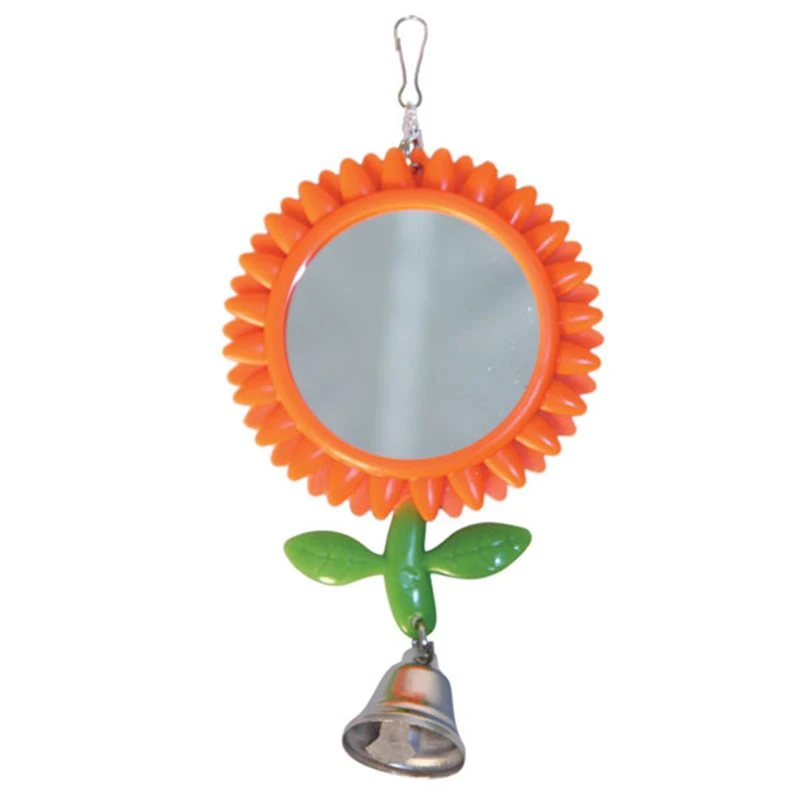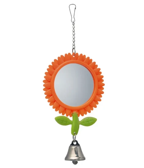 Яркое зеркало на цепочке со звонким колокольчиком представляют собою две увлекательных игрушки. Зеркало является собеседником Вашего пернатого - видя свое изображение он начинает активное общение и изучение друга (подружки), а если рядом имеются игрушки, то попугайчик будет рад поиграть ими со своим новым “зеркальным” другом. Наобщавшись со своим отражением попугай переключит свое внимание на звонкий колокольчик. Колокольчик является одной из любимых игрушек у большинства попугаев; при манипуляциях (толкании клювом) игрушка издает звук как бы общаясь с пернатым. Зеркало крепится на металлический карабин к потолку клетки либо на игровой площадке, за пределами дома пернатого.