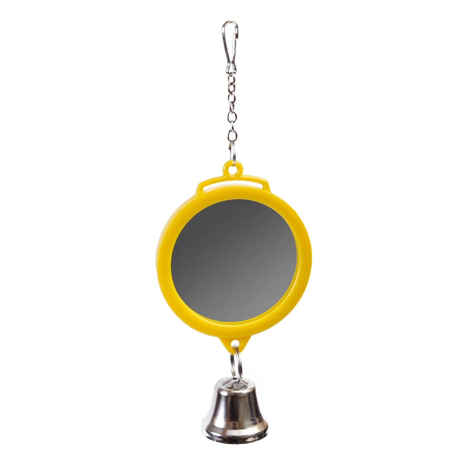 Яркое зеркало на цепочке со звонким колокольчиком представляют собою две увлекательных игрушки. Зеркало является собеседником Вашего пернатого - видя свое изображение он начинает активное общение и изучение друга (подружки), а если рядом имеются игрушки, то попугайчик будет рад поиграть ими со своим новым “зеркальным” другом. Наобщавшись со своим отражением попугай переключит свое внимание на звонкий колокольчик. Колокольчик является одной из любимых игрушек у большинства попугаев; при манипуляциях (толкании клювом) игрушка издает звук как бы общаясь с пернатым. Зеркало крепится на металлический карабин к потолку клетки либо на игровой площадке, за пределами дома пернатого.
