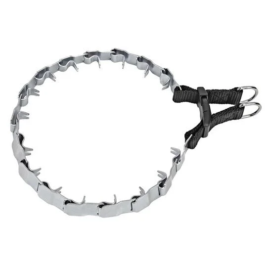 Ошейник из металлических пластин с загнутыми со стороны шеи собаки шипами. Крайние звенья крепятся к стропам и закрепляются на фастекс. Детали ошейника оцинкованные. Ошейник собран из 15 оцинкованных звеньев - 12 основных звеньев, 2 крайних звена, 1 соединительное звено. Ширина звена 2,2 см. Длина ошейника 50см.